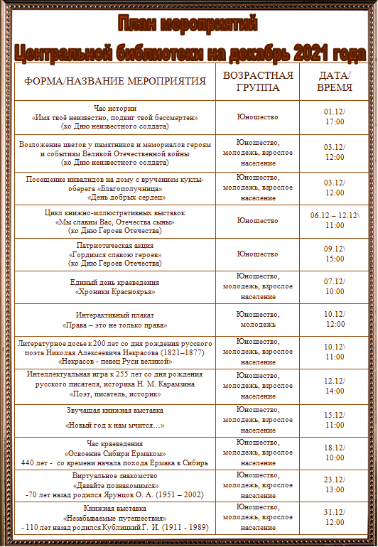 План мероприятий Центральной библиотеки на декабрь 2021 г.
